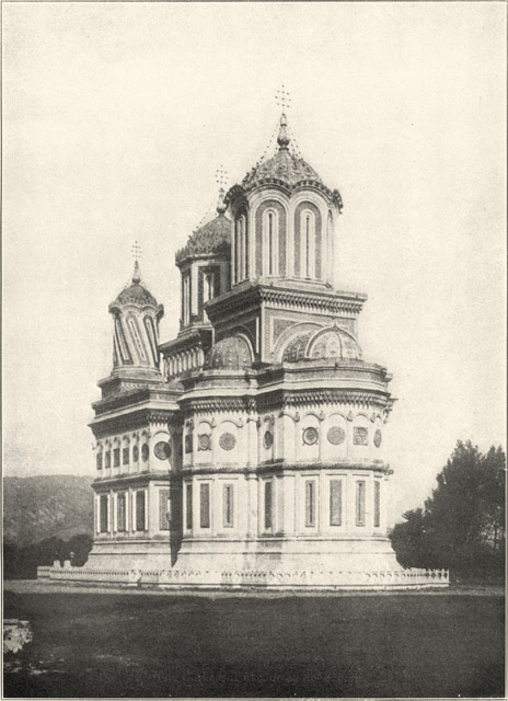"King Carol and Queen Elisabeth loved this sacred monument beyond any other in the land; always did they speak of it as of the place in which they wished to be laid to rest one day. Now they lie there side by side, those two companions, those two hard workers, those forerunners who knew much of the storms and vicissitudes of life. . . . . Old King Carol was the first to be laid within the sanctuary he had treasured. No vault was dug beneath the church, his coffin was simply led down under the marble flags of the floor, quite close to those who were the founders of the church in the sixteenth century: Neagoe Basarab and his wife Militza." Then came Queen Elisabeth's turn: "I often bless Providence for allowing "Carmen Sylva" to rejoin her husband before the fatal hour struck. She so entirely believed in the unshakable strength of her race, in its God-given right to be master of the world, that indeed too cruel would have been the blow." It is absurd to imagine that discussion of politics with their successors could have disturbed the last days of that devoted royal pair. After the war, however, these successors did not favor Pelesh. Its memories possibly were too haunting; they sought their estates at Pelishor and Cotroceni, and the chateau perched on the Carpathian rocks remained only a symbol of a former reign—a reign austere and laborious yet sumptuous. There is another grave, however, still more dear to Queen Marie—that of her youngest son at Cotroceni abandoned when the Teutonic invasion pressed hard. The inscription she caused to be placed there after the war reads as follows: