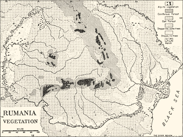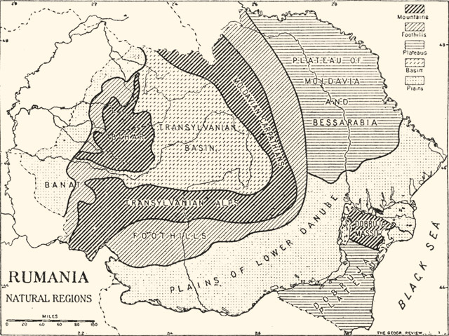 Let us examine each of these natural regions more closely. The most striking feature of the build of Roumania is the great arc of high mountains which forms the backbone of the country. These mountains of the Carpathian system go under different names in different parts. The section running from the Danube eastward, known as the Transylvanian Alps, merits its name by certain similarities with the Alps of Switzerland. Here may be found lofty jagged peaks, indented by glacial cirques, with lakes and cascades. The mountains as a whole, however, are neither so high nor so continuous a barrier. More characteristically they rise to rounded plateau-like summits penetrated by deep valleys, some of which cut a passage through the chain. East of the Predeal Pass the chain swings northward under the name of the Moldavian Carpathians. Scenery changes as well as direction. The ancient crystallines of the western section are replaced by weaker rocks. Here the Alpine type of scenery is entirely lacking. Altitudes are lower: the mountains present a maze of flat-topped summits with rounded wooded flanks. In the extreme north of the chain, the Mountains of Bukovina, the Alpine type again appears. Such is the continuous arc of mountains which encircles the basin of Transylvania on its southern and eastern sides. The Bihar massif completes the mountain girdle of the basin on its western side. This block has been left standing while the surrounding land has subsided. A steep escarpment frowns over the valley of the Muresh beyond which there stretch plateau-like summits deeply cut by streams and diversified by volcanic relief. The mountains of the Carpathian system have been the greatest boon to Roumania in the past, for here her persecuted people have fled in times of trouble. Numberless fertile valleys are still occupied by Roumanian farmers, descendants of these fugitives and representatives of the purest Roumanian type. Not only in the past but at the present the mountain zone is a great asset. The forests which clothe the flanks provide the material for one of the most promising of the growing industries, while the proximity of arid lands such as Egypt and large portions of the Mediterranean coastal regions make timber valuable as an article of commerce. Further, the mountain streams provide the power to drive many mills. The age-old practice of transhumance, that is, the driving of flocks up to summer pasture and the return to winter in the lower land, still continues and provides a valuable link between the opposing flanks of the chain. Although the mountains themselves have no valuable mineral wealth except building stone, yet the same processes which formed the mountain chain are responsible for the mineral wealth which is found along their borders. Distinct from the Carpathians in structure as well as position is the mountainous mass of the northern Dobrudja. It seems to be an isolated overthrust of the same system as the mountains of the Crimea. The summits are wooded, and copper has been mined on the northern edge of the mountains; but their chief commercial importance at present is as a source of building stone. The Carpathian foothills of Roumania (including the foothills of the Banat), the extent of which is shown in Figure 1, are in many ways the most interesting part of the country. The hills, which rarely exceed 600 meters (2000 feet), are the remains of a dissected plateau. The valleys are from 250 to 100 meters (800 to 300 feet) deep. They are exceedingly fertile and are well sheltered, separated but not isolated by the surrounding wooded heights. Conditions of safety, varied resources, comparative ease in gaining a living, with possibilities of intercommunication have supported a marked development of the characteristic Roumanian culture of the foothills. The costumes, embroidery, legends, and customs in this region bear witness to the individuality and wealth of this culture. The density of population is very great in some of the chief valleys of eastern Wallachia (Muntenia) and in the so-called sub-Carpathian depression which in places separates the mountains proper from the foothills. Such has been the role of the foothill region in the past; at the present time it still is one of the most important regions, for here is found Roumania's most remarkable asset, petroleum. The characteristic scenery of the foothills, the gay wooden houses of the Roumanian peasant, surrounded by fields of maize, with a flock of sheep on the near-by hillside and the cumbersome slow-moving oxcart, is suddenly replaced by an unsightly compound of temporary premises, with high pumping apparatus, chimneys, and rubbish heaps, while over all there lingers the smell of oil. The region of moderate relief second in importance is the basin of Transylvania. This area of relative depression, which lies, however, at a fairly high altitude, is itself broken up into a number of basins by low wooded hills. The hills are the remains of a much more accidented region; they have not only been worn down by erosion but also have been half submerged by the eroded material. There is similarity of structure but difference in the proportion of hill to plain as one journeys from north to south in Transylvania. Towards the north the hill gains on the plain, the stretches of flat land become smaller, and the general character of the scenery more undulating. Transylvania is one of the most productive parts of Roumania and at the same time one of her greatest problems. The climate in summer is hot enough to ripen maize and grapes. The presence of timber, abundance of streams, sufficient rainfall, and fertile soil have always made of Transylvania an attractive region, and people have been drawn in from all the surrounding lands during all periods of history. Mineral wealth has but added to the general diversity of the population. Roumanian hamlets or isolated farms, big German villages, straggling Hungarian towns come into sight one after