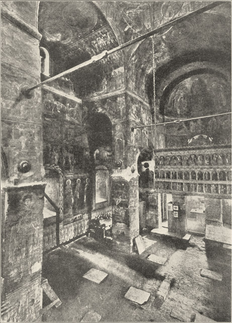 But what makes Curtea-de-Argesh (the Court of Argesh) a pilgrimage spot for art students is its painting, which in artistic value surpasses all else the East can offer at this moment. Under modern additions, and earlier frescoes of the sixteenth and seventeenth centuries, remarkable in themselves, have now been laid bare majestic types and scenes, with broad and tranquil countenances and flowing robes, with something of the serenity of Giotto's figures in the Scrovegni Chapel at Padua. The date can be fixed by Greek and Slav descriptions and by graffitti on the walls of the fourteenth century. It is doubtless the work of Greek masters of the Oriental school, but they evidently utilized earlier designs or had come under the influence of the new art then arising in Italy—which would not be surprising, in view of Basarab's relations with the West. We are certain of Venetian influence—either direct or through her Dalmatian outposts —in the church of Deal ("hill"), or St. Nicholas of the Vineyards, near Tirgovishte, the third capital of Wallachia (the second, Campulung, an ancient Teutonic settlement, has lost its ancient monastery as well as the royal chapel, and even the tomb of Basarab's son is housed in a comparatively modern edifice). The Deal church, a square stone building, with sculptured plaques to right and left of the entrance, is clearly Venetian in style; and the inscription, still in Slav, for Roumanian was not adopted for such purposes till the end of the century, is written in Cyrillic characters of altogether Western aspect. Unfortunately the paintings were long ago destroyed, so that those of Argesh, with their Italian air, remain unique. Neagoe, one of the successors of Ralph (Radu) the Great (founder of the Deal monastery) , married a Serb princess with imperial ambitions; their son bore the Byzantine name of Theodosius. Their desire to surpass earlier magnificence led them to redecorate the new convent church of Argesh and the metropolitan church of Targovishte, which had several times been worked over and recently entirely torn down. With the help of Oriental architects, sculptors and even painters from Transylvania (one a pupil of Veit Stoss), as well as native artists, he presented his country with a strangely beautiful building. The new church of Argesh at once became famous for its tilted towers, its flower-embroidered reliefs, its brilliant fields of gold and azure, and the paintings which adorned it within. These had not entirely vanished at the time of the restoration of the building at the hands of Viollet-le-Duc. Even yet figures like the St. George, with his helmet resting on his shoulder, and his hair falling down in long curly waves, standing alert with sword in eager hand, have a surprising reminiscence of Albert Dürer himself, whose spirit penetrated through Transylvania into this Wallachia which had now long been reconquered by the traditions of Oriental art. |