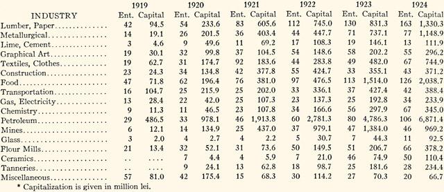 ECONOMICALLY Roumania has all the natural elements essential to the development of an industrial structure capable of satisfying a large proportion of its national needs. While it is true that up to the time of the World War Roumania was to be classed among those nations which were largely dependent on its agriculture, immediately after the war this situation was completely modified owing to the acquirement of well-developed industries in the newly-won territories formerly under Austria-Hungary. Nevertheless, because of the efforts made during the thirty years preceding the war, Roumania had succeeded within limitations in creating several branches of industry connected with the products of agriculture and the natural riches of the soil. Such pre-war efforts, conducted by the Government with a view to encouraging the creation of a national industry, were eminently justified by the fact that the old economic structure contained most of the elements indispensable to the development of such a national industrial organization. Agricultural products on the one hand and natural wealth of soil on the other, especially in the production of timber and oil, furnished important raw materials capable of being utilized by an "infant" industry. Besides, Roumania had the advantages of cheap labor and a local market assured by a protectionist policy. The influx of foreign capital, to which Roumanian industry offered a good investment, supplied the deficiency of local capital essential to the creation of a national industry. Under a highly protective tariff and the law of 1886 (modified in 1912), which encouraged national production, in the natural course of events, had there been no war, Roumania would have unfailingly prospered in time and foreign capital, given such favorable conditions, would have flowed into the country. The extractive industries, developing Roumania's untold mineral riches, did show considerable growth, as for example the stone quarries, the salt, and petroleum mines; also those branches of industry dealing with the raw materials of agriculture and the exploitation of forest land, such as flour mills, tanneries, lumber, and textile mills. But the lack of coal and iron retarded a great development of the metallurgic industries, which in turn are essential to the development of other manufacturing, so that, except in a few cases, we remained economically subservient to foreign countries. On the eve of the war three branches of industry—petroleum, lumber and flour—had attained such growth that they were able not only to satisfy internal needs but to contribute an important percentage, next to cereals, to the exports of the country. In the span of a few years these three industries had succeeded in gaining a sure outlet in the markets of the Near East, particularly in Turkey, Asia Minor and Egypt, helping appreciably, along with agricultural products, to maintain a favorable balance of trade. Most of the commercial houses established in these industries were organized Avith foreign capital principally from Germany and Austria, and in less degree from England, France, Belgium and Italy. At the outbreak of the war, as far as industrial equipment was concerned, Roumania was amply prepared for local needs, and at the same time was able to export considerable quantities of other products. After the war, and the consequent territorial expansion of Roumania, which brought in regions rich in natural resources as well as all sorts of industrial establishments, the economic structure of the country was finally completed, losing in part its exclusively agrarian character and taking on thenceforth a new mixed aspect: agrarian-industrial. Bukovina, Transylvania, and above all, the Banat contributed largely to the industrial development of the country by the number of their industrial establishments and their natural resources. The iron and coal lacking in the old economic order are now furnished us by Transylvania and the Banat. This has had the effect of supplying a great need and overcoming the previous obstacles in the way of national industrial expansion. The new territories having been for a long period under foreign domination, it is only natural that their industrial enterprises should still show the earmarks of their former rule. As far as the general economic structure of Roumania is concerned, however, this industrial addition means an increase of great value in equipment and production. It must be remembered that at the close of the war our industries were in dire straits as a result of systematic destruction, attempted dismantling, and disorganization by our erstwhile enemy, while in the regained provinces, where machinery was untouched, industrial plants were ready to resume activity as soon as the war was over. Whatever the final industrial organization of the new State may be, its industries enjoy primarily the great advantage of being self-sufficient as to essential raw materials. In addition, they have conscientious, skilled and cheap labor; are able to depend upon the support of the Government for a really protective tariff; and finally, they are coming to find in the interior market their principal outlet, with an increasing capacity for consumption as the standard of living rises. The post-war crisis of the exchange prevented the Government from developing a well-defined tariff policy, but the insufficiency of this tariff was offset by continuance of the freight rates on the pre-war level. Subsequently, as the needs of the State required greater funds to meet increasing general expenses, the law for the encouragement of national industry, which offered great fiscal advantages, had to be modified to increase taxation, which bears heavily upon industry in its present state. Allowance being made for general conditions, however, national industry progressed, notwithstanding unfavorable circumstances after the war, thanks to the efforts of the Government in coming to its aid. The