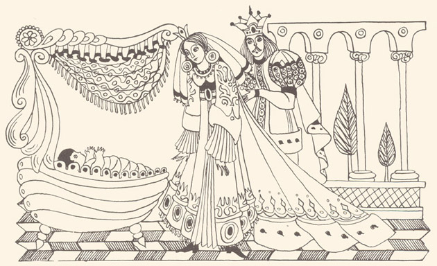 It happened once upon a time. For had it not happened there would be nothing to tell. It happened in the days when poplar-trees bore pears and willow-trees flowered into violets; when bears fought each other by colliding their tails; and when wolves and lambs embraced, kissing each other like true brothers. In those days a fly would sign its name on the wall. The bigger liar he who doesn't trust me at all. Once upon a time there was a great emperor and an empress. Both were young and handsome, and as they wanted to have children they did everything that was necessary to that end. They asked wise men that they should read their fortune in the stars and tell them if they were to have children. But ail in vain. At long last the emperor heard of a clever old man in a neighbouring village and sent for him. But the old man said to the messengers: "Those who want advice, let them come to me." So then the emperor and the empress made ready and taking along a few boyars, soldiers, and servants, they made for the old man's house. As soon as he saw them from afar the old man came to meet them and said: "Welcome, and I'm glad to see you in good health. Yet what is it that Your Highness is trying to find out? The longing you have shall bring sorrow." "I have not come to hear that," said the emperor, "but rather, if you have any cure that would enable us to have children, to ask for it." "That I have," the old man said. "But one single child shall you beget. He will be Prince-Handsome the Well-Beloved, but you shall have no joy of him." After a time, the empress gave birth to a son. |