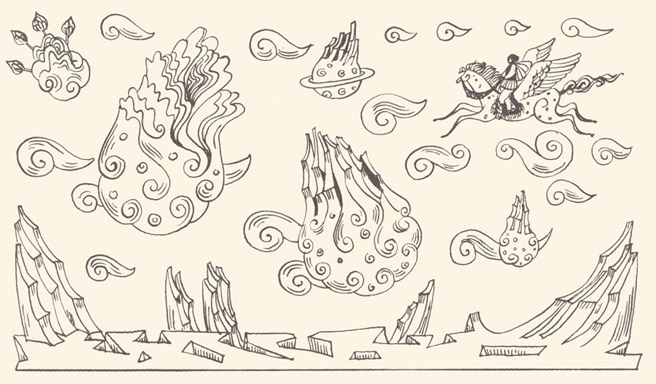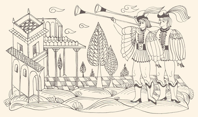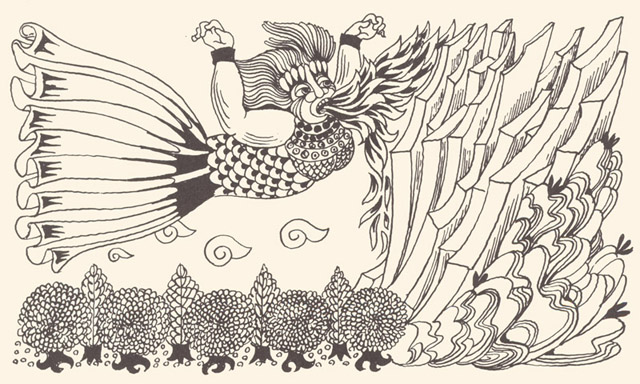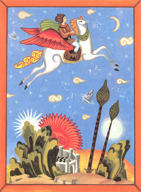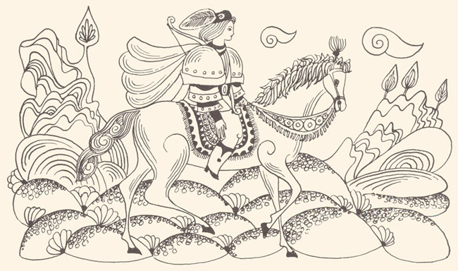 However, after the hour of his birth the child began to sob and no doctor was able to quieten him. Then the emperor started promising him all the wonders of the world, but it was still not possible to put an end to his sobbing. "Quiet, my son," the emperor would say, "for I shall give you such and such lands. Be still, son, for I shall give you such and such emperor's daughter in marriage." And so on and so forth. Finally, seeing there was no way of soothing him he added: "Be quiet, my son, for you shall have youth everlasting and life without end." At that the baby stopped crying. The emperor's men beat the drums and blew their fifes and for a week there was great rejoicing throughout the empire. As he grew older so did the boy become more astute and more daring. They sent him to schools and to men of learning, but all the schooling that took other children one year to learn, he would master in one month, so that the emperor was as happy and as proud of his son as he could be. The whole empire would boast that it would have a wise and learned emperor such as King Salomon had been. Yet after a while there seemed to be something wrong with the boy for he was constantly melancholy and sad and deep in thought. One fine day, on the boy's fifteenth birthday, just as the emperor was dining and making merry with all the boyars and the dignitaries of the empire, Prince-Handsome got up and spoke thus: "Father, the time has come for you to give me that which you promised at my birth." Upon hearing this the emperor grew very sad and said to him: "How now, my son, how could I possibly give you a thing unheard of? And if I then made such a promise it was solely to soothe you." "If you, Father, cannot give it to me, then I must ransack the world in quest of that for which I came into this world." At these words the emperor and the boyars fell upon their knees pleading that he should not leave the empire. "Your father is now an old man," the boyars said, "and we shall put you upon the throne and shall get you the handsomest princess under the sun to be your wife." But they were unable to change his mind, he being as hard as a rock in his decision. Seeing there was no way out, his father gave him his blessing and ordered food to be prepared and all the necessaries got ready for the journey. Prince-Handsome then went to the court stables, which held the finest horses in the whole empire, to choose one for himself, but as soon as he grabbed one by the tail it would fall down, and in this way, one after the other, all the horses went down. Just as he was leaving the stable, he once more glanced around, and saw in one corner a horse that was covered with sores and was mere skin and bones. He went up to him, but when he grabbed him by the tail the horse turned its head and said: "What is your wish, Master? Thank God for granting me days that I might once more feel the touch of a brave man's hand." And straightening his legs he stood as upright as a candle. Then Prince-Handsome told him what he meant to do, and the horse said to him: "In order to have your wish you must ask your father to give you the sword, the lance, the bow, the quiver and the arrows, and the armour that he wore as a young man. And me you must tend with your own hands for six weeks, and the barley you give me must be boiled in milk." When the prince asked the emperor for the things that the horse had advised, the emperor sent for the court steward and commanded him to open ail the chests containing clothes so that his son could choose those he liked best. Having rummaged for three days and three nights, Prince-Handsome at last found the weapons and armour that had been his father's when a young man, but they were very rusty. He began to clean off the rust with his own hands and after six weeks he succeeded in making them bright like a mirror. At the same time he tended the horse as he had been told to. Work he had in plenty, but no matter since he succeeded. When Prince-Handsome told the horse that the armour and weapons were well cleaned and polished and ready for use, the horse suddenly shook himself and ail sores fell off him and he appeared just as young as he had been years before: a strong shapely horse with four wings. Seeing him thus, Prince-Handsome said: "In three days from now we'll be off." "God bless you, Master," the horse answered. "I'm ready today, if you'll have it." |